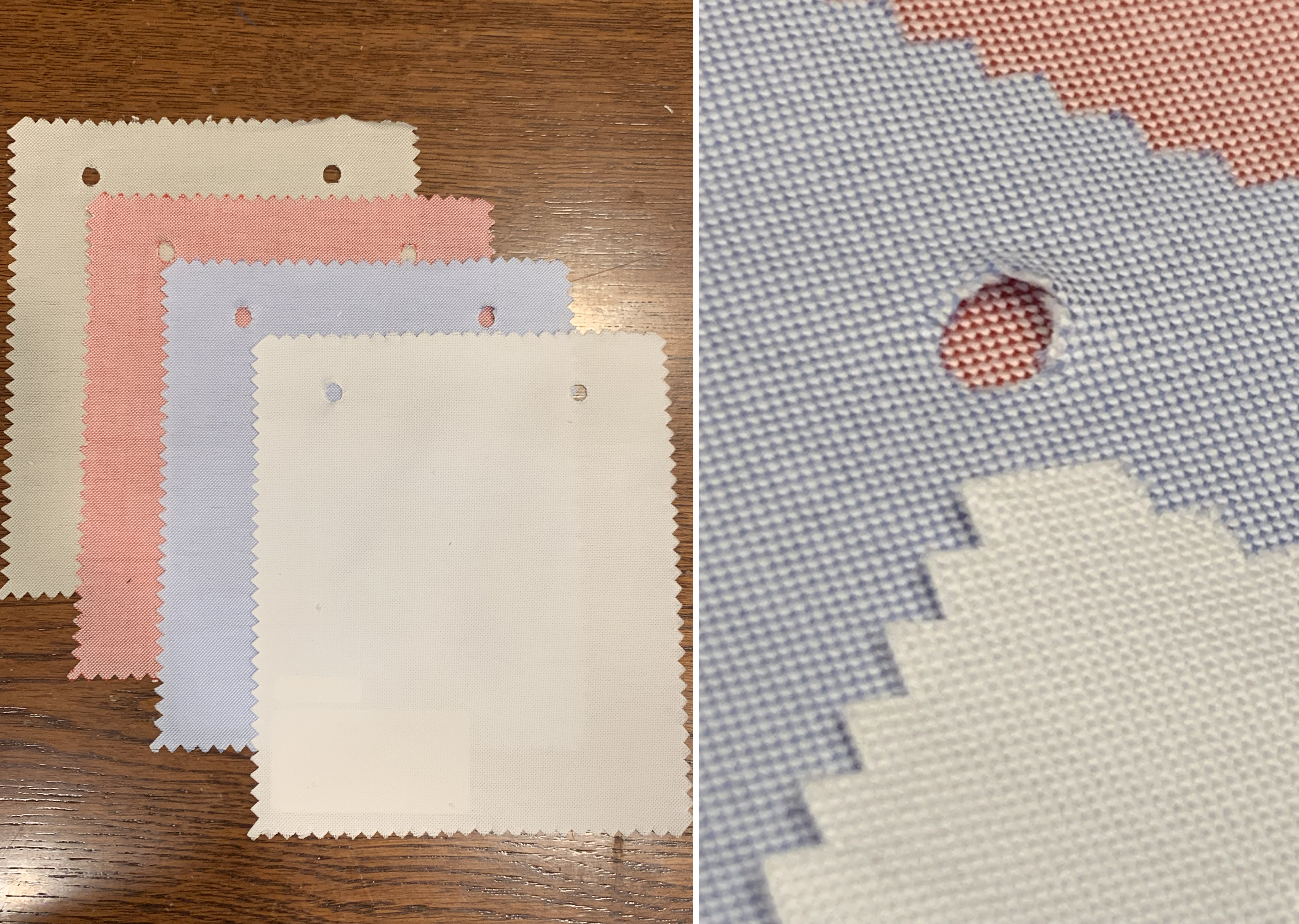 オックスフォード生地とは、2本の縦糸と横糸を引き揃えて織る「斜子織り(バスケット織り)」を用いた平織物です。通気性が良く、厚みがあるのに柔らかい肌触りが特徴で、上品な光沢もあります。
